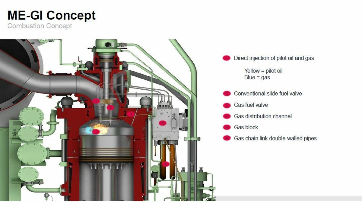Dual fuel operation requires injection valves for both pilot fuel oil and gas. The FBIs operate as main injection valves when the engine operates in fuel oil mode and as pilot oil injectors when the engine operates in dual fuel mode. This means that the engine does not require additional or special pilot oil valves. The top cover of the 90 and 95ME- Gl has three FBIVs and three gas injection valves. When the gas injection valves are opened with hydraulic oil, a gas jet is injected into the combustion chamber.